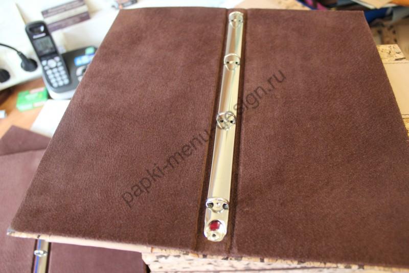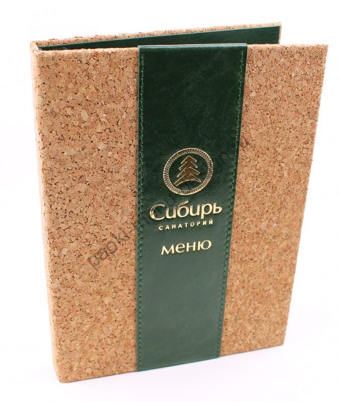 Папка меню из пробки (натуральный пробковый переплётный материал). Внутренние части папки могут быть выполнены из различных материалов: натуральной замши, натуральной подкладочной кожи, искусственной кожи, баладэка. Максимально натуральный вид данной папки для меню обеспечивается материалами: пробка, кожа, кожзам, замша. Крепление листов на выбор: кольцевой механизм, корень на винтах. Пробковое меню очень экологичное, натуральное и приятное на ощупь.