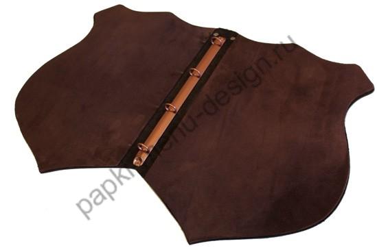 Фигурная папка меню из натуральной кожи. Эти и подобные папки меню очень эффектно смотрятся блвгодаря своей необычной форме. Наша папка украшена ещё и хольнитенами медного цвета. Крепление листов на выбор: кольцевой механизм, корень на винтах.