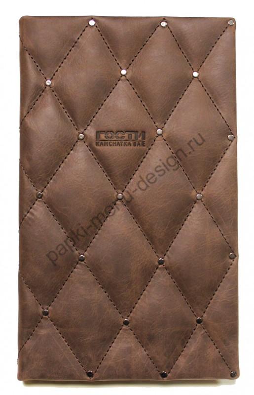 Эта папка изготовлена из натуральной кожи с выразительной фактурой "Пул-Ап". Необычность и эксклюзивность данной папки меню не только в том, что она из интересной дорогой кожи, но и в исполнении. Крупная стёжка с хольнитенами обеспечивает объёмность ромбам. Внутри папка отделана натуральной замшей. Способ крепления листов на выбор: кольцевой механизм, корень на винтах.
