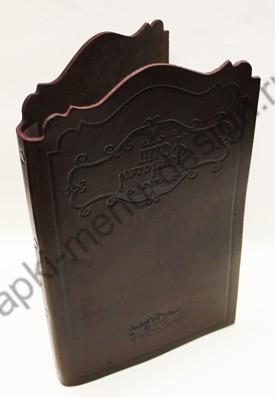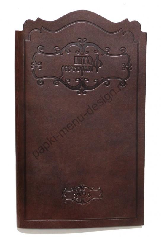 Фигурная однослойная папка меню из чепрака - толстой бычьей кожи. Благодаря тому, что кожа грубая - эта папка меню отлично держит свою ажурную форму. Если Вам надоели классические модели папок меню "как у всех" - закажите оригинальную папку меню. Способ крепления листов на выбор: кольцевой механизм, корень на винтах. Такая папка для ресторана - это шикарно и очень эксклюзивно.