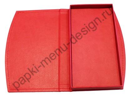 Папка меню из искусственной кожи оригинальной формы. Данная папка меню из кожзама имеет стандартные размеры и предназначена для меню с размером листа А4, но могут быть и другие индивидуальные размеры папки по Вашему желанию. Широкая цветовая гамма материалов для изготовления данной модели. А так же могут быть другие узоры в соответствии с логотипом Вашего ресторана, кафе, бара. Так же Вы можете заказать шкатулки (папки счёт) для счёта и денег в таком же стиле.