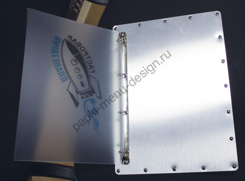 Планшет для меню из металла с обложкой из прозрачного матового пластика с печатью логотипа УФ-красками. Возможны и другие цвета металла: золото, красная медь, бронза. Данный планшет меню - это оригинальный подход к подаче меню. Но это далеко не все его достоинства: планшет из металла - это практично и удобно.