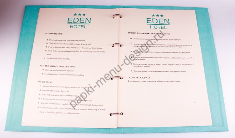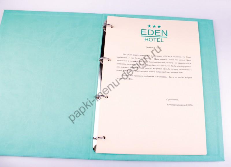 Нарядная современная папка гостя для отеля в пастельных нежных тонах (на выбор кроме бирюзового: светло-сиреневый, бежевый, голубой, белый). Папка изготовлена из матового кожзама, протирается влажной тряпкой, не боится заливов, долговечная. Формат папки под лист А4, крепление: кольцевой механизм. Информационная папка гостя необходима в каждом отеле и гостинице - согласно закону правила проживания в отеле должны находится в каждом номере на видном месте. Поэтому папка гостя - это не просто аксессуар, а соответствие закону о гостиничных услугах. Папка гостя с фирменным логотипом - это престиж заведения, дополнительная реклама, соответствие фирменному стилю заведения. Мы изготавливаем любые папки гостя для отелей.